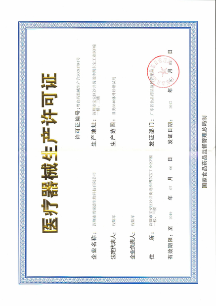 Standart: Medical device manufacturing licenseSayı: XSYJXSCXB No.20091794Yayımlanma tarihi: 2019-01-10Bitiş tarihi: 2024-01-09